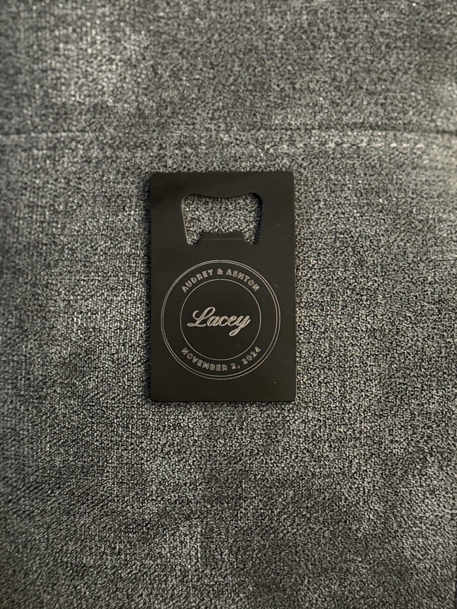 Customized metal credit card size bottle openers. Contact us for bulk pricing. Great party favors or to display your business name.