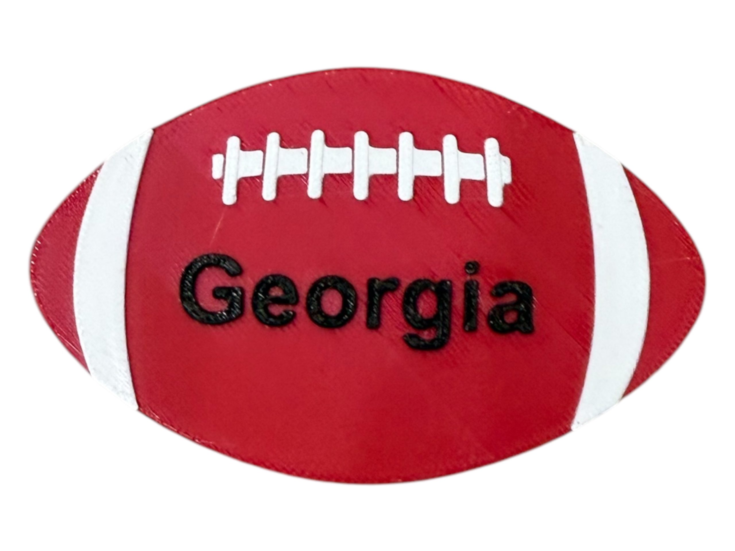 Celebrate your Georgia Bulldogs passion with our football charm. Each piece is carefully 3D printed using durable PLA filament for authentic red and black team colors with “Georgia” text proudly displayed.